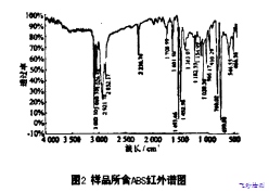 圖2為利用丙酮溶解物涂膜經(jīng)干燥測試的紅外譜圖。該譜圖顯然就是ABS的結(jié)構(gòu)譜圖。由溶解實驗得知.超過一半的樣品溶于丙 酮。而KBS溶解于丙酮中。這就驗證了主要基體成分是ABS樹脂。另外。在1710aa附近出現(xiàn)了酮的羰基C=O呀W4峰。這可能與丙酮干燥揮發(fā)不完全有關(guān)。