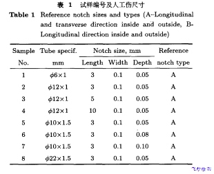 由于鈦合金薄壁管材超聲檢測具有靈敏度高、檢測盲區小、多為自動檢測等特點,因此對儀器設備的要求同常規超聲檢測相比有一定的區別,通常認為,鈦合金薄壁管材超聲檢測中,人工傷對超聲波聲束的反射主要是刻槽與基體材料之間的端角反 射,因此人工槽的寬度對聲束反射影響較小,為了實驗不同尺寸鈦合金管材人工傷對檢測結果的影響,結合具體應 用制作了一組不同深度和長度人工傷的試樣,試樣編號及尺寸如表1。