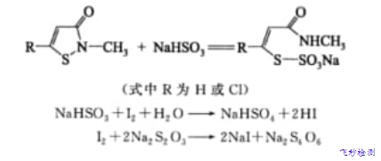 異噻唑啉酮衍生物與亞硫酸氫鈉定量反應(yīng),過量的亞硫酸氫鈉與碘反應(yīng)。用硫代硫酸鈉溶液滴定過量的碘。