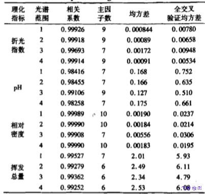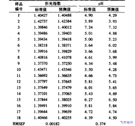 通過不斷地模擬實驗可以總結出所建模型適用于不同種類的香精與料液,可快速同時對樣品的折光指數、pH、相對密度及揮發總量四種理化指標進行預測,預測均方差RMSEP分別為0.00182,0.374, 0.00393與3.0
