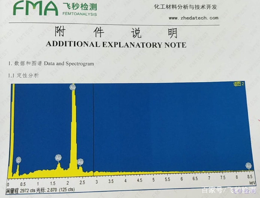 飛秒檢測利用自有的FEI場發(fā)射掃描電鏡,對(duì)樣品進(jìn)行形貌觀察,同時(shí)做EDS進(jìn)行能譜分析。從而了解該樣品中的鍍層是否含有真金。